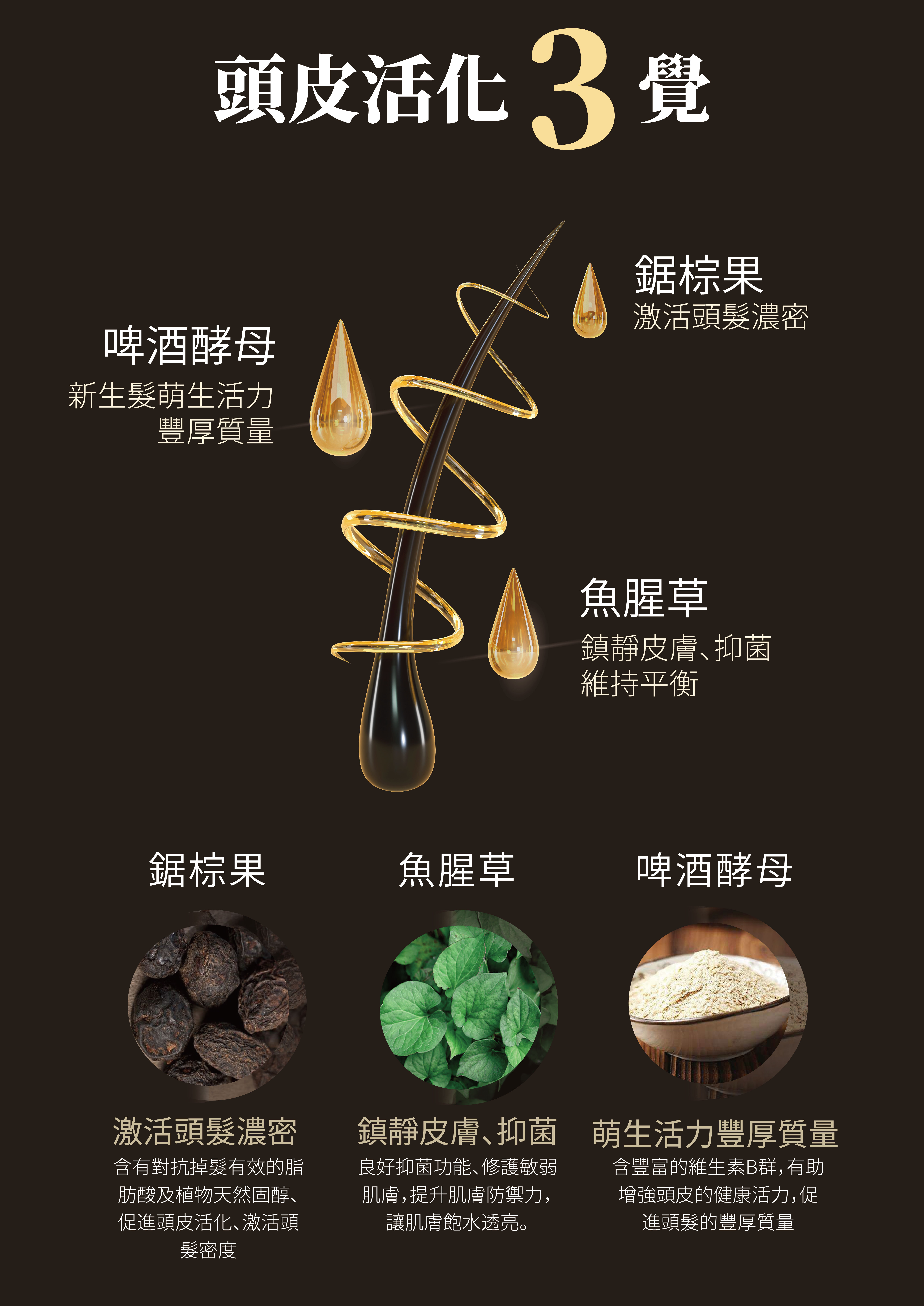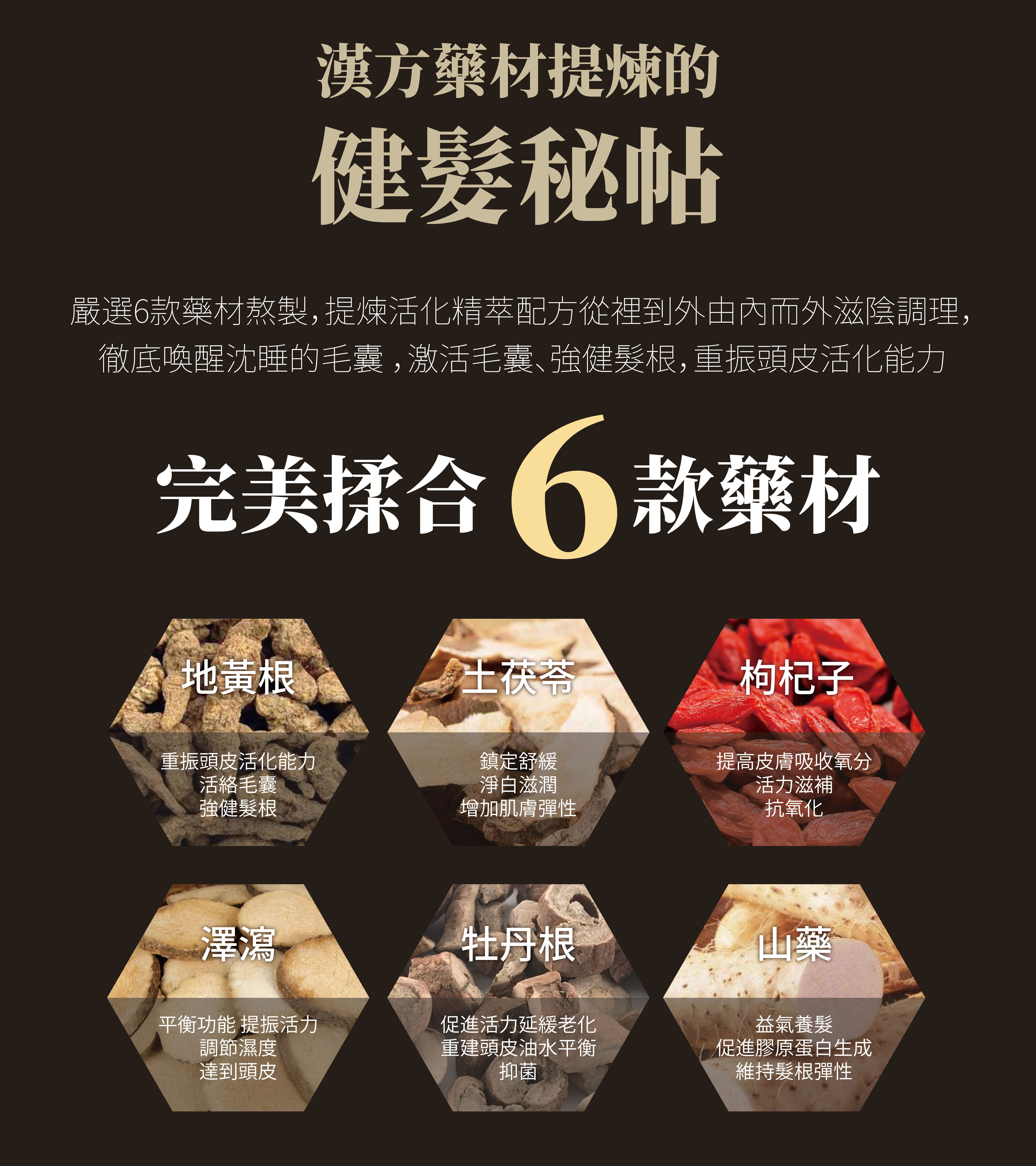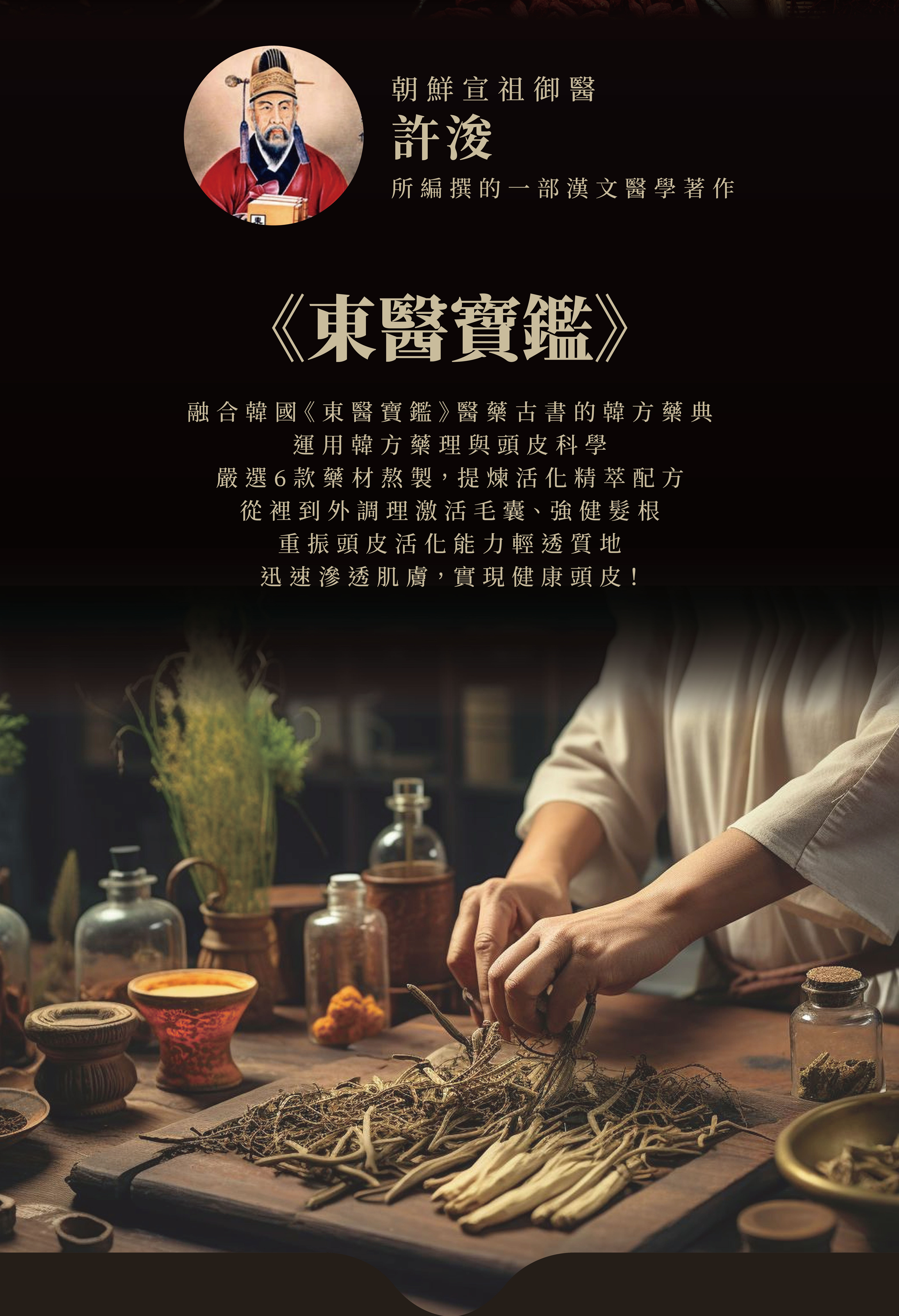 完美融合韓國《東醫寶鑑》醫藥古書所載的韓方藥典,運用韓方藥理智慧與頭皮科學,從2萬多種韓方草藥之中嚴選6款藥材熬製,提煉活化精萃配方從裡到外由內而外滋陰調理,徹底喚醒沈睡的毛囊 ,激活毛囊、強健髮根,重振頭皮活化能力輕透質地,迅速滲透肌膚,實現健康頭皮!