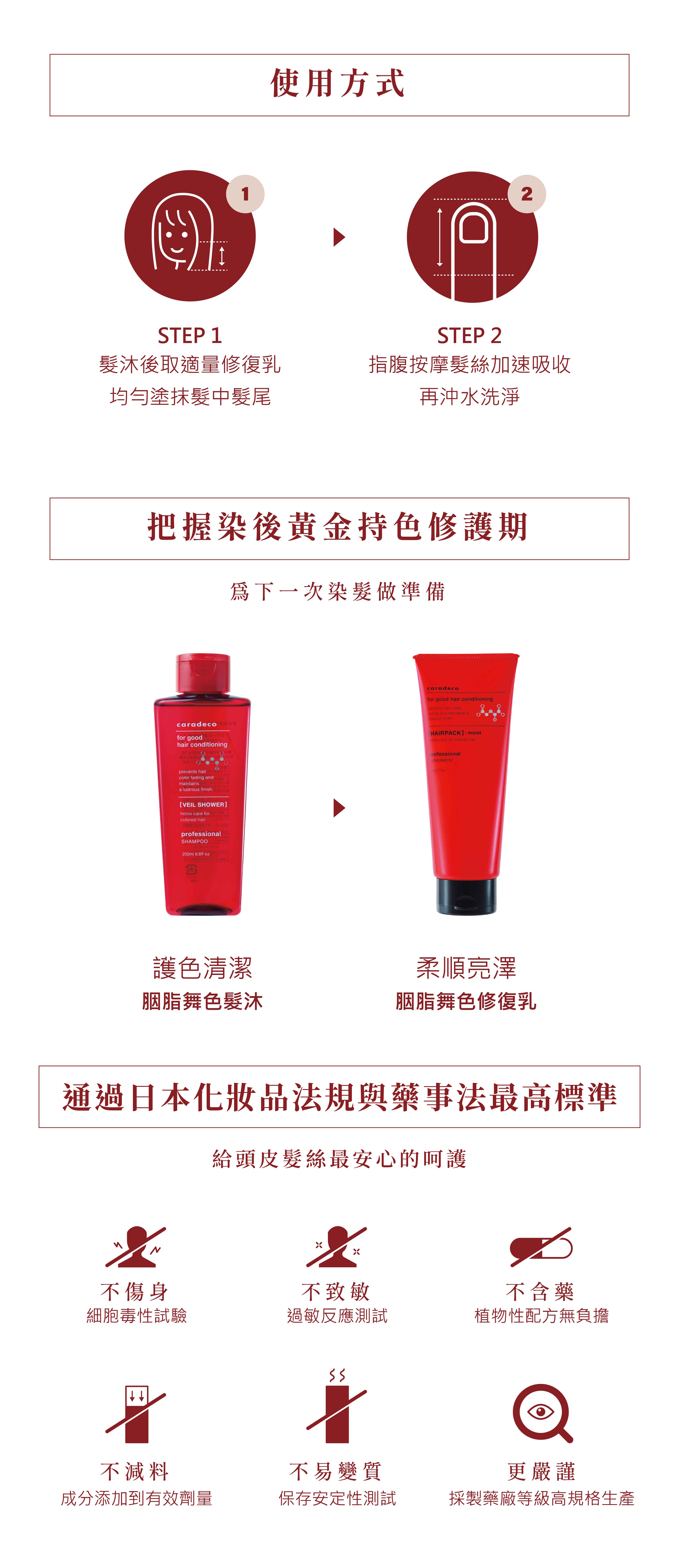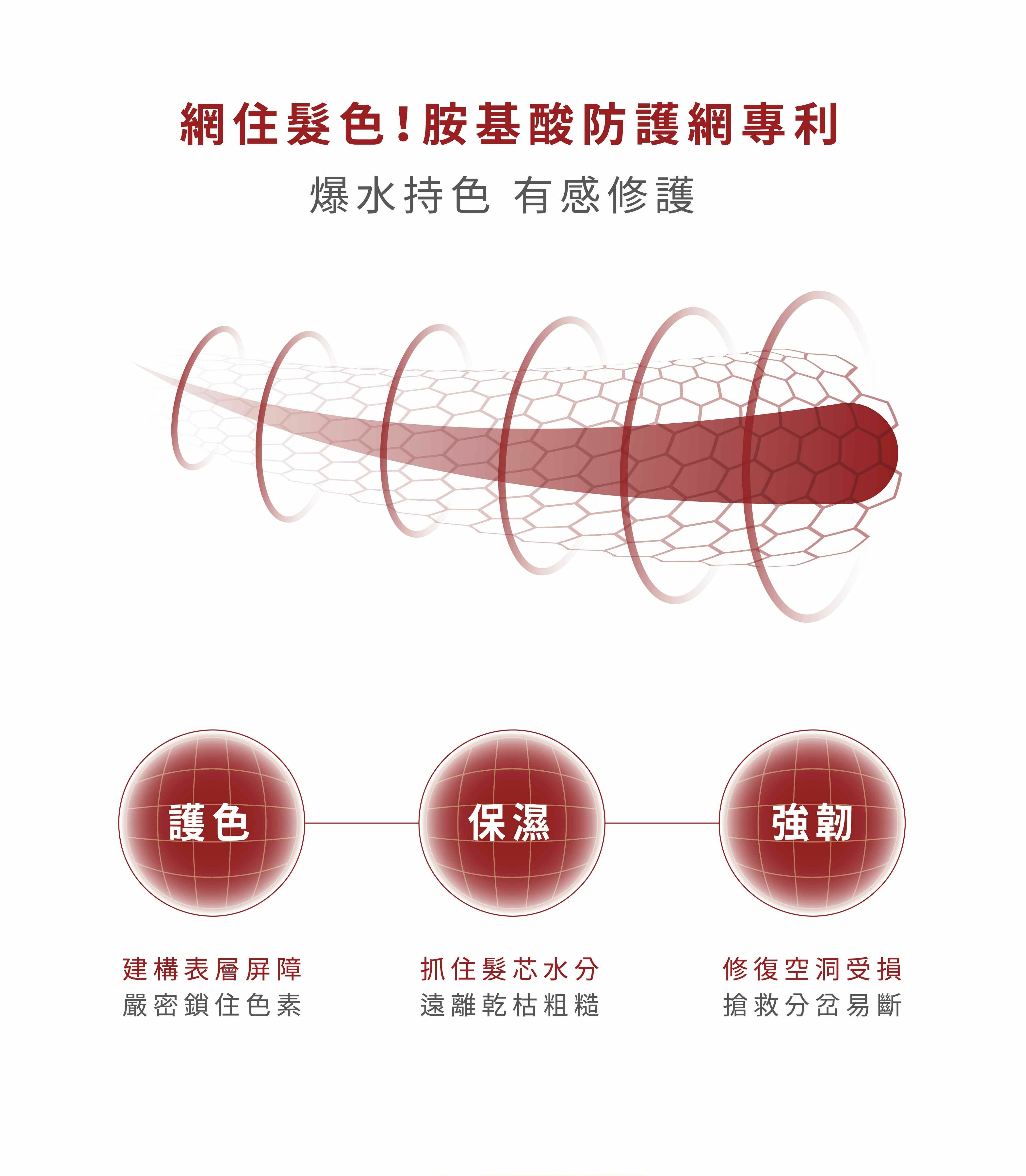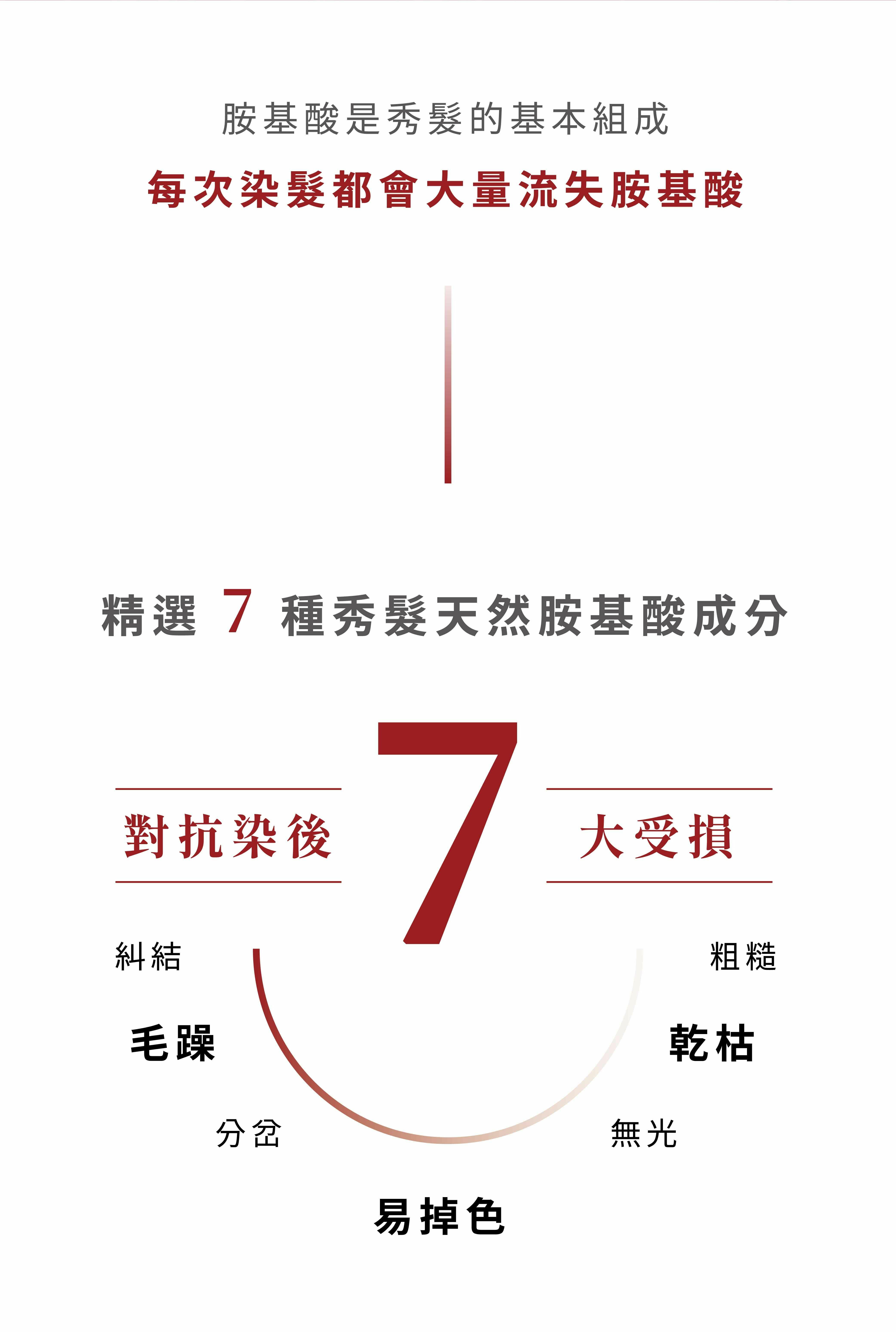 ◎ 不含矽靈,幫助頭髮補充7種染髮後易流失的胺基酸,深層修護頭髮受損