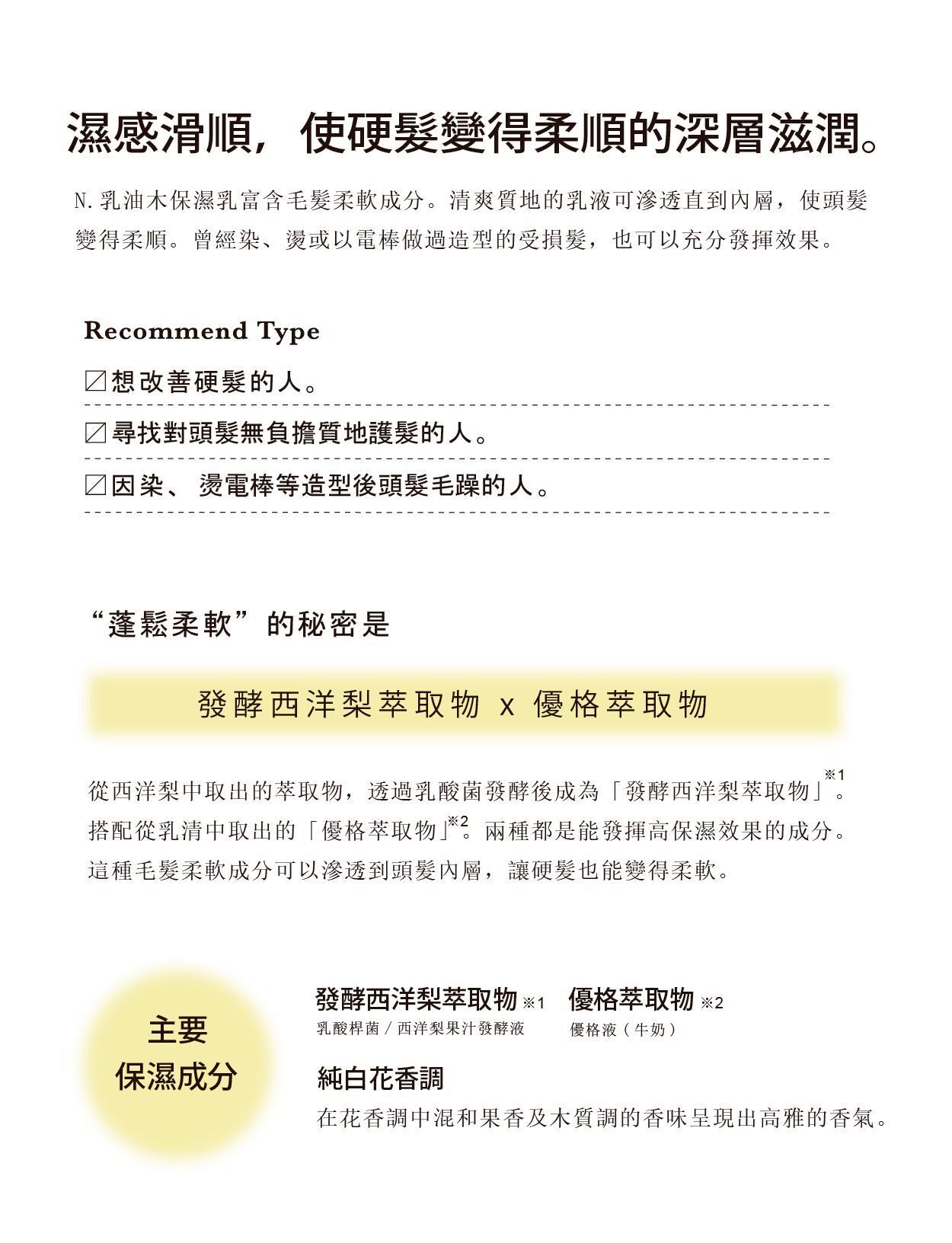 N.乳油木保濕乳富含毛髮柔軟成分。