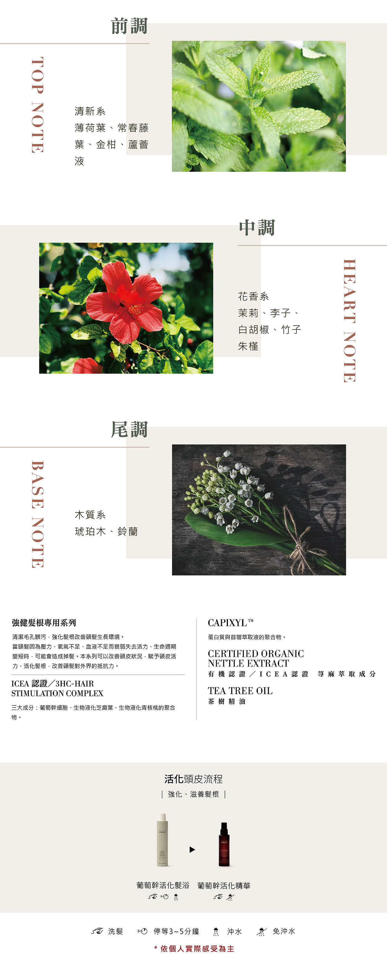 【前調】清新系:薄荷葉、常春藤葉、金柑、蘆薈液