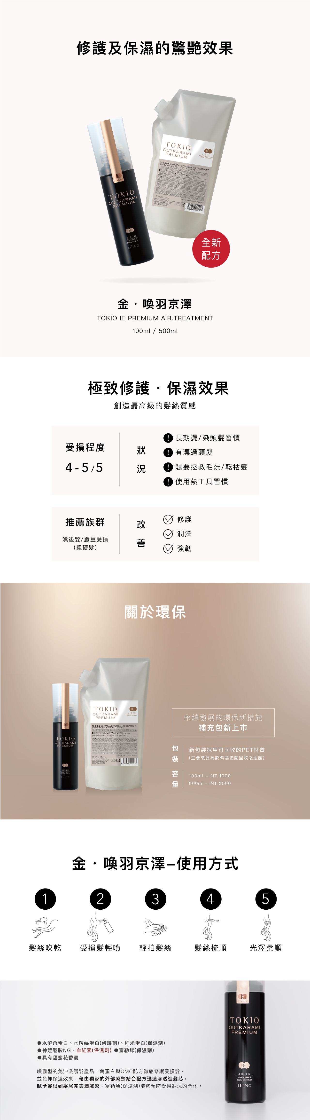 【金系列】噴霧型的免沖洗護髮產品。立即補充修護頭髮角蛋白、油份、水份、CMC、抗氧力,賦予頭髮保濕、柔順、光澤與彈性的最佳狀態。