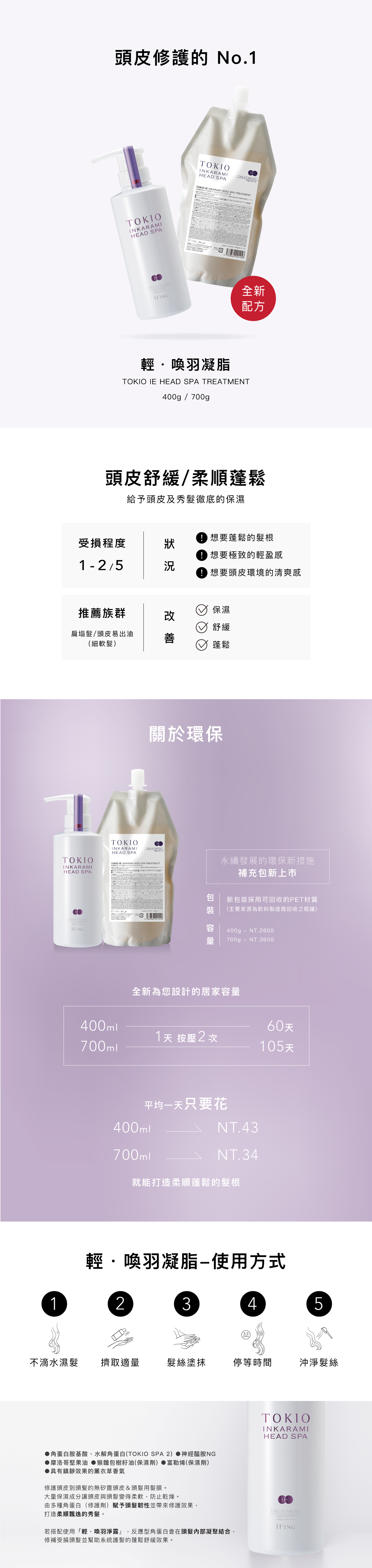 【用法】使用輕・喚羽淨露後,塗抹在髮絲上,簡單按壓後停留三分鐘,再沖掉即可。