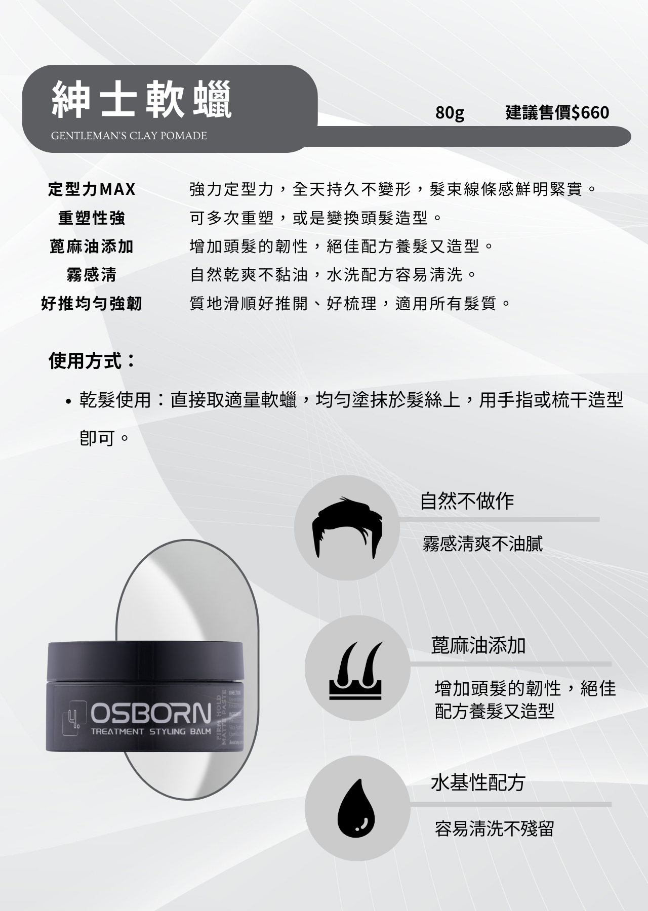 -霧感清爽,自然乾爽不黏油,水洗配方容易清洗。
