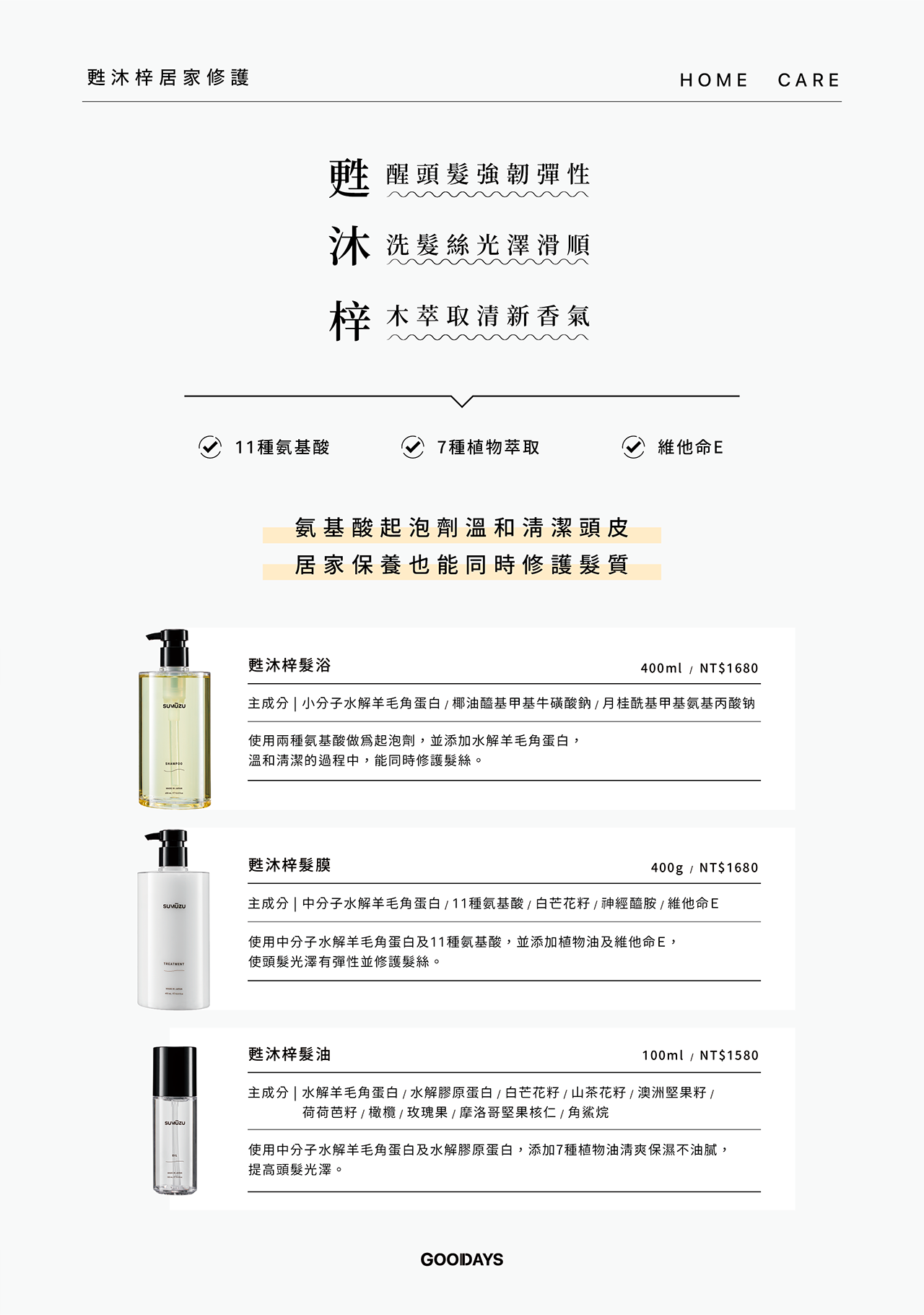 使用中分子水解羊毛角蛋白及11種氨基酸,並添加植物油及維他命E,使頭髮光澤有彈性並修護髮絲。